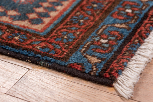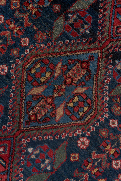 The field displays a pole medallion of nine hexagons enclosing geometric palmette and other vegetal motives, and edged with tiny lozenges. A flower chain runs up along the field sides and a mustard keyhole reciprocal edges it. The pile is excellent. �