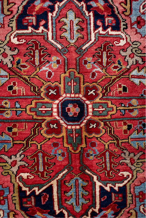 Located in north west Iran, Heriz is one of the most well known rug weaving centers. They are woven with geometric designs on a cotton foundation using the symmetrical (Turkish / Ghiordes) knot. They usually come with a large central squarish medallion with pendants either ends.