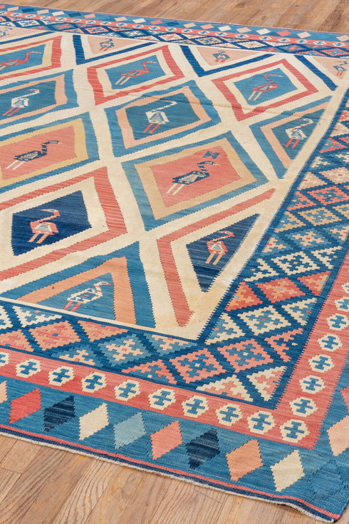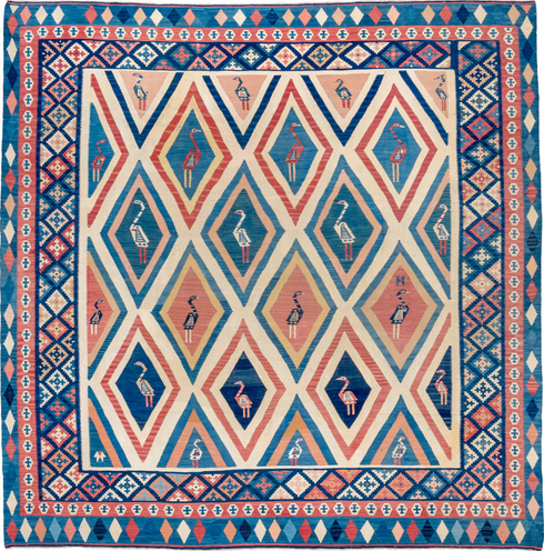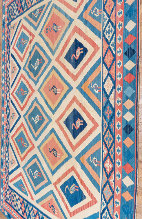 A Kilim is a flat woven rug where the weft strands are used to create the design. They nearly always have bold geometric patterns due to the technical difficulties in weaving curved lines.