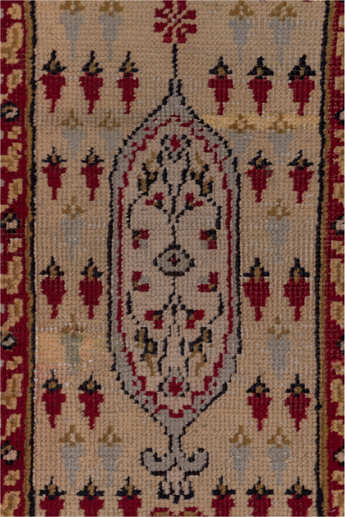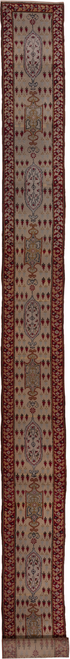 The snd field alternates ivory ellipses with orange-rust cartouches with small dark red-brown 'trees' scattered about. The narrow dark red-brown border features abstract straw leaves. Great for a narrow staircase.