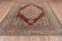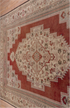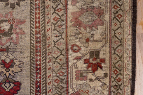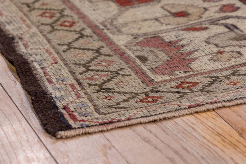 This rather sharply drawn piece shows a beige and ecru inner field and a red outer field especially evident in the palmette-filled corners. Sharp serrated edges to the field and medallion. Ecru border with turtle-like simple palmettes and bud sprays. Moderate weave.