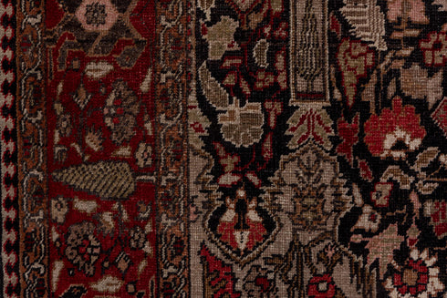 Definitely in the Persian Kashan style, this well-woven Anatolian rug shows a pair of columns with broad sand extensions at each end, with a close scatter of leaves and flowers, on the dark brown ground. Red border of cypresses alternating with unusual palmettes.