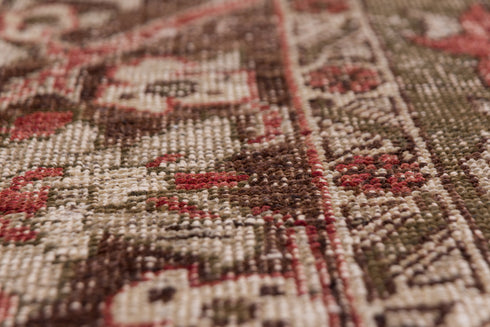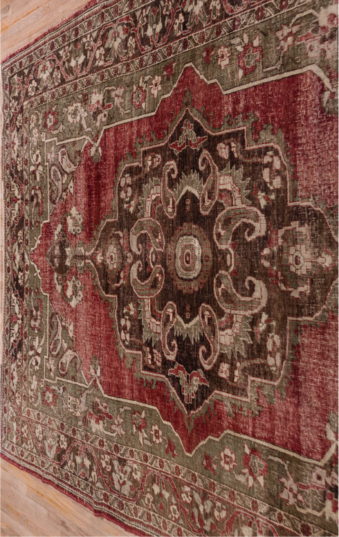 This striking piece shows a red, abrashed cartouche sub-field enclosing a conforming wine-red medallion with an eight boteh Sub-medallion. Coral red field with mobile leaves and flowers. Red border of slanted acanthus leaves and various garden flowers. Shows wear, but still striking.