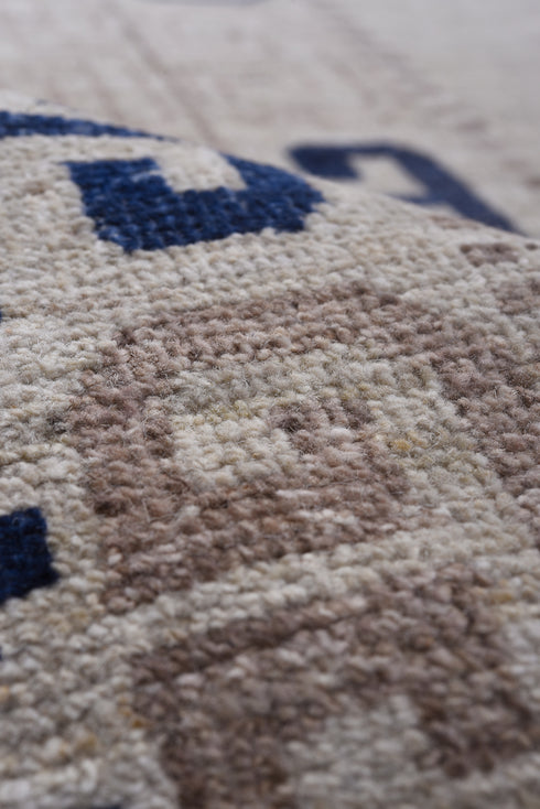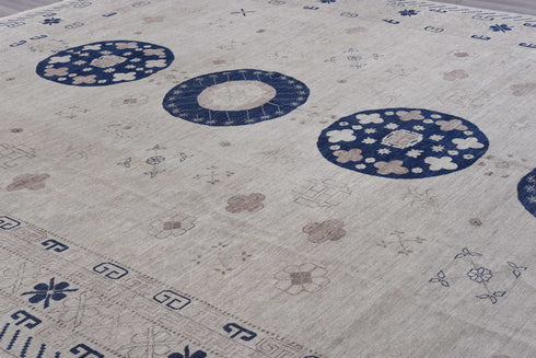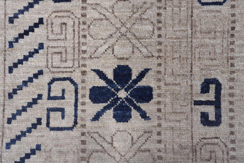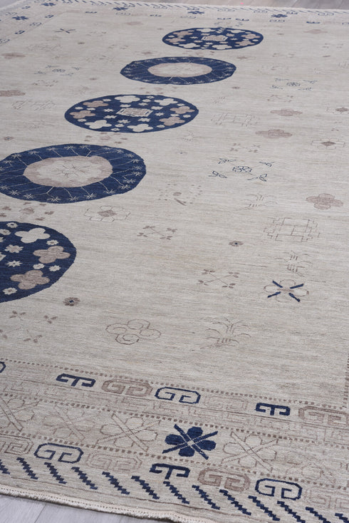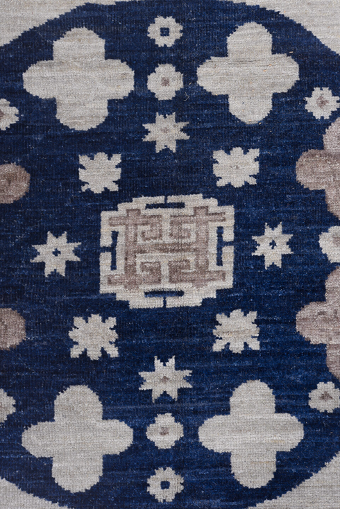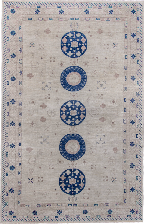 Khotan rugs are from the Chinese autonomous region of Xinjiang, Chinese Turkestan. These unique rugs made in the towns Khotan, Kashgar, and Yarkand are often referred to as Samarkand after the main trading town in the region. They have a combination of designs and being on the silk route have influences from their Chinese, Turkoman, and Turkish neighbors. Fretwork, cloud borders, trellis patterns, pomegranates and carnations all are incorporated into their designs.They are of long and relatively narrow size with simplistic and spacious designs.