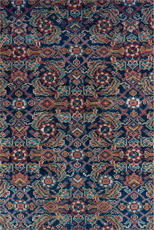 This is a totally iconic west Persian town scatter rug with a detailed all-over Herati pattern densely covering the abrashed dark navy to royal blue field, set within a red border with a faceted ivory Meander, and boteh and rosette minors.