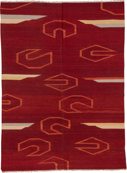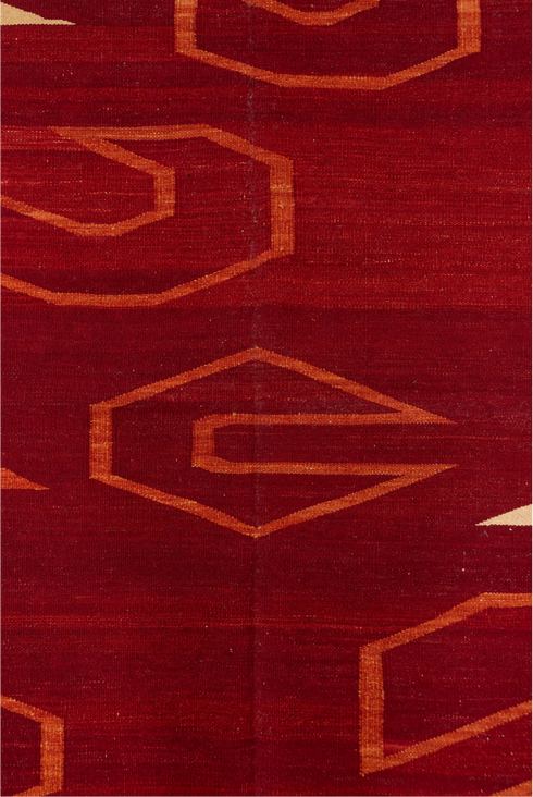 A Kilim is a flat woven rug where the weft strands are used to create the design. They nearly always have bold geometric patterns due to the technical difficulties in weaving curved lines.