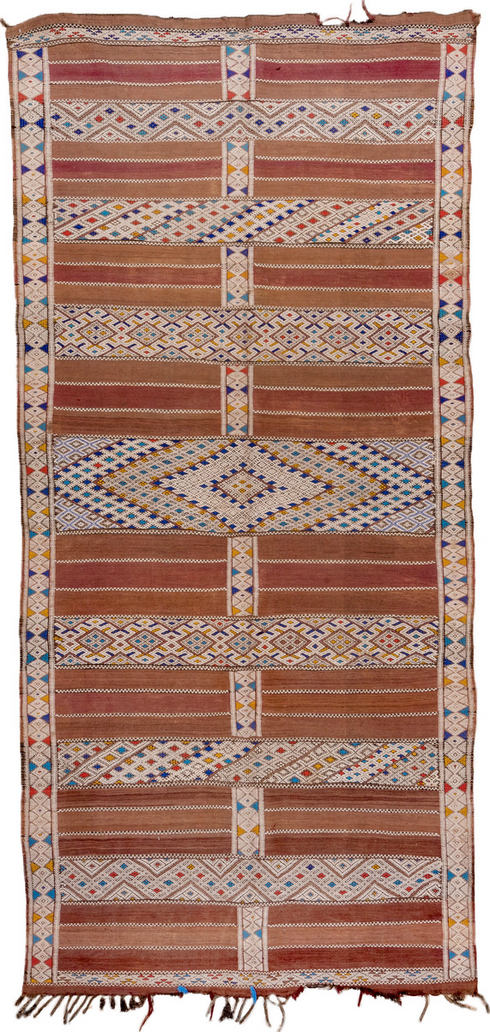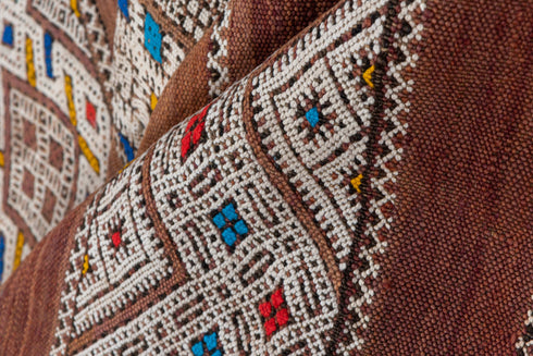 Moroccan Kilims are flat woven rugs using the weft threads and additional embroidery or float wefting where the weavers are able to express themselves using natural symbols and geometric forms to create unique pieces.