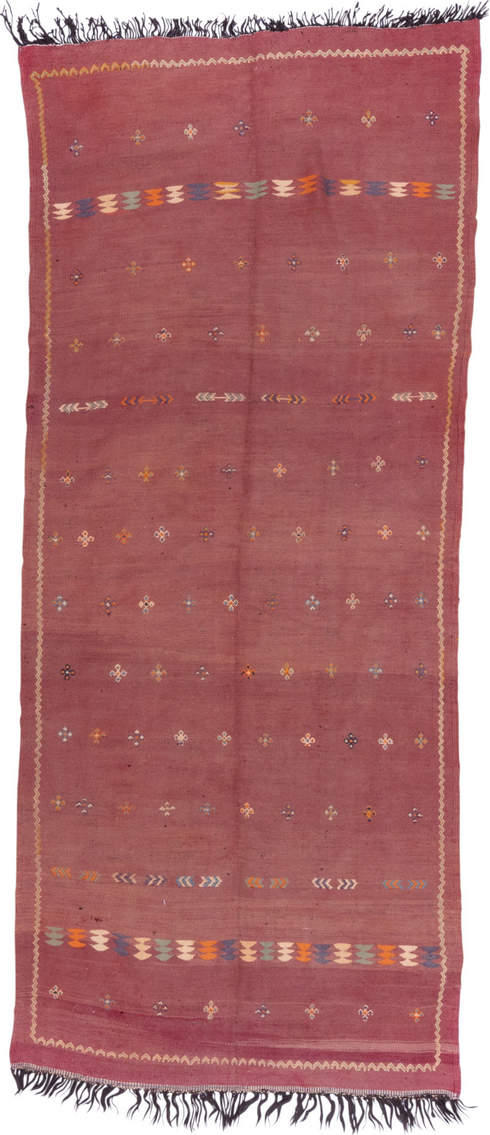 Moroccan Kilims are flat woven rugs using the weft threads and additional embroidery or float wefting where the weavers are able to express themselves using natural symbols and geometric forms to create unique pieces.