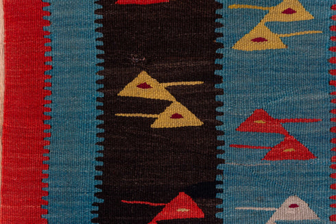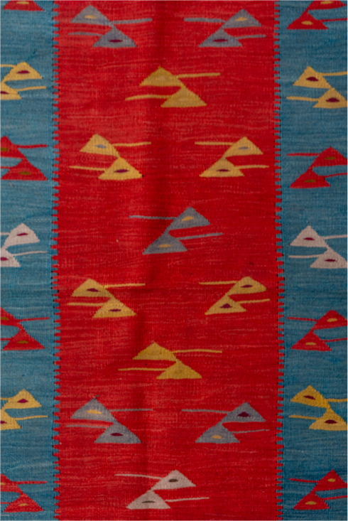 A Kilim is a flat woven rug where the weft strands are used to create the design. They nearly always have bold geometric patterns due to the technical difficulties in weaving curved lines.