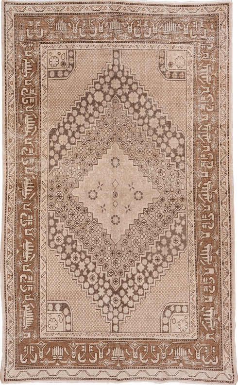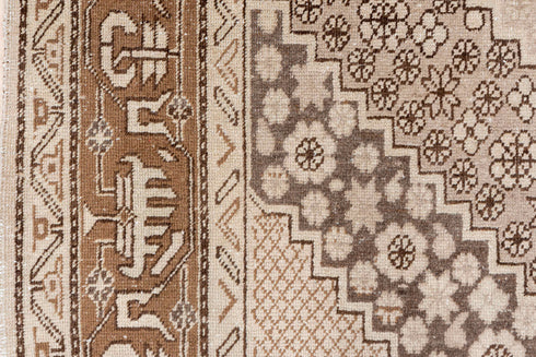 Khotan rugs are from the Chinese autonomous region of Xinjiang, Chinese Turkestan. These unique rugs made in the towns Khotan, Kashgar, and Yarkand are often referred to as Samarkand after the main trading town in the region. They have a combination of designs and being on the silk route have influences from their Chinese, Turkoman, and Turkish neighbors. Fretwork, cloud borders, trellis patterns, pomegranates and carnations all are incorporated into their designs.They are of long and relatively narrow size with simplistic and spacious designs.