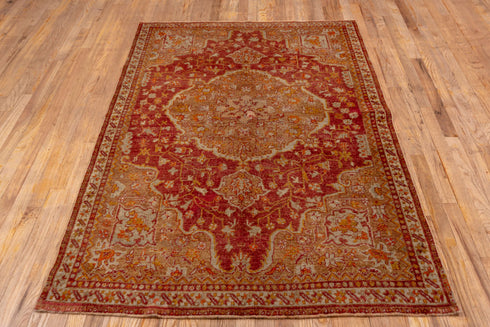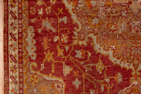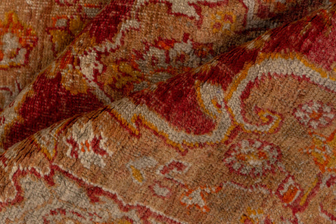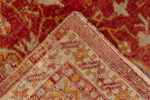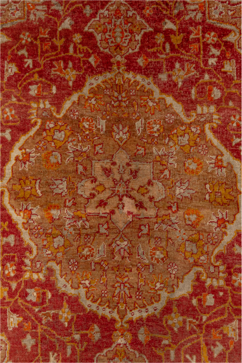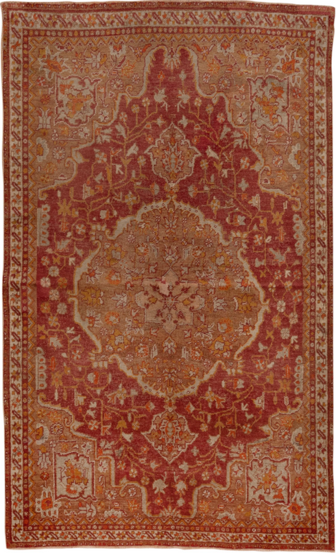 Decorative antique carpets from Sivas in the southeast are finely woven and formal, tending to interpret the classical Persian style with central medallions and floral infill. A palette of soft and pale gelato tones in the typical antique Sivas rug makes it more feminine and sugary than other any other antique Turkish carpet. In the early nineteenth century, on the outskirts of Instanbul, the Hereke carpet workshop was established, becoming famous for producing exceptional, finely woven carpets of outstanding technical ability. These antique Hereke rugs often feature luxurious materials such as silk and metal-thread worked into designs emulating the antique Persian carpets of the Ottoman and Safavid Court workshops. Ghiordes, in the western part of Turkey, is known for precisely figured, colorful, multi-bordered antique prayer rugs with open prayer niches, and stylized architectural motifs.