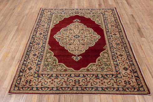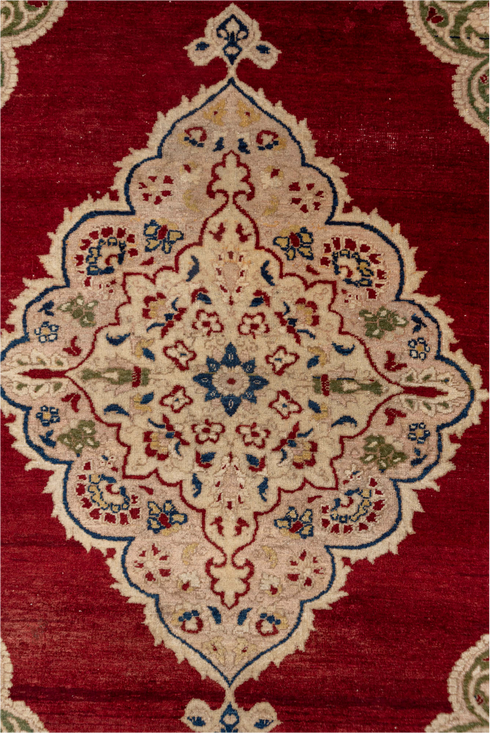Decorative antique carpets from Sivas in the southeast are finely woven and formal, tending to interpret the classical Persian style with central medallions and floral infill. A palette of soft and pale gelato tones in the typical antique Sivas rug makes it more feminine and sugary than other any other antique Turkish carpet. In the early nineteenth century, on the outskirts of Instanbul, the Hereke carpet workshop was established, becoming famous for producing exceptional, finely woven carpets of outstanding technical ability. These antique Hereke rugs often feature luxurious materials such as silk and metal-thread worked into designs emulating the antique Persian carpets of the Ottoman and Safavid Court workshops. Ghiordes, in the western part of Turkey, is known for precisely figured, colorful, multi-bordered antique prayer rugs with open prayer niches, and stylized architectural motifs.