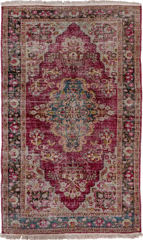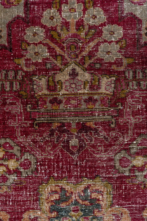 Decorative antique carpets from Sivas in the southeast are finely woven and formal, tending to interpret the classical Persian style with central medallions and floral infill. A palette of soft and pale gelato tones in the typical antique Sivas rug makes it more feminine and sugary than other any other antique Turkish carpet. In the early nineteenth century, on the outskirts of Instanbul, the Hereke carpet workshop was established, becoming famous for producing exceptional, finely woven carpets of outstanding technical ability. These antique Hereke rugs often feature luxurious materials such as silk and metal-thread worked into designs emulating the antique Persian carpets of the Ottoman and Safavid Court workshops. Ghiordes, in the western part of Turkey, is known for precisely figured, colorful, multi-bordered antique prayer rugs with open prayer niches, and stylized architectural motifs.
