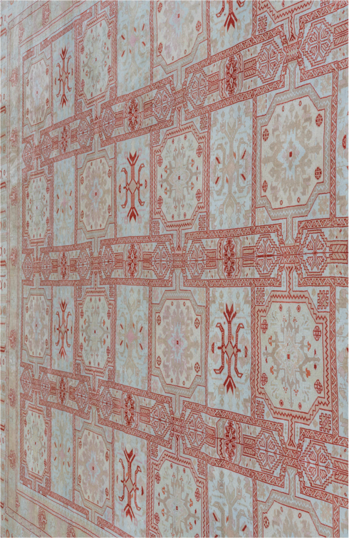 The antique Borlou carpet most closely resembles the dramatic scale, informality and pleasing palette of the oriental rugs in nearby Oushak, later manifesting itself in grand room size carpets.